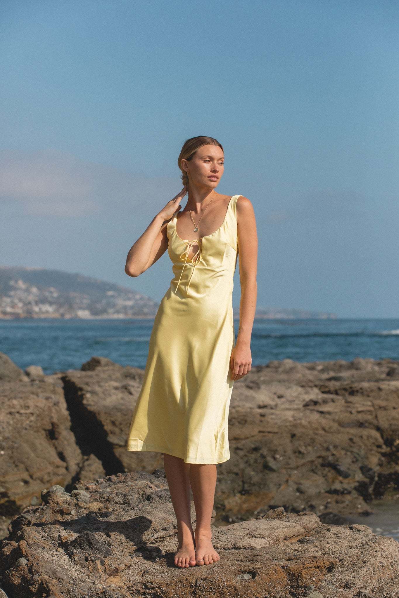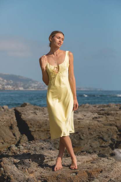 The Andie Woven Satin Midi Dress combines a silky lemon color with a comfortable and effortless fit, making it the perfect summer wardrobe essential._