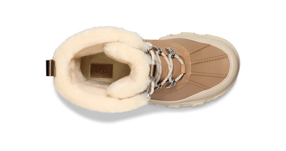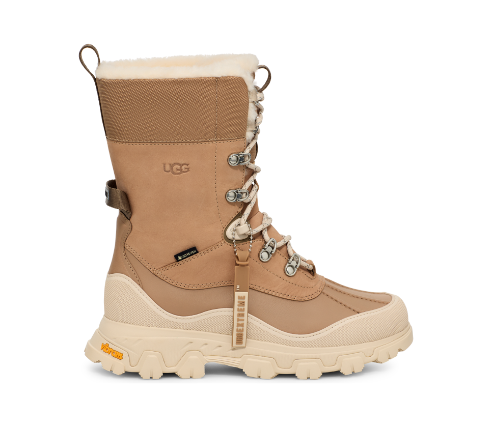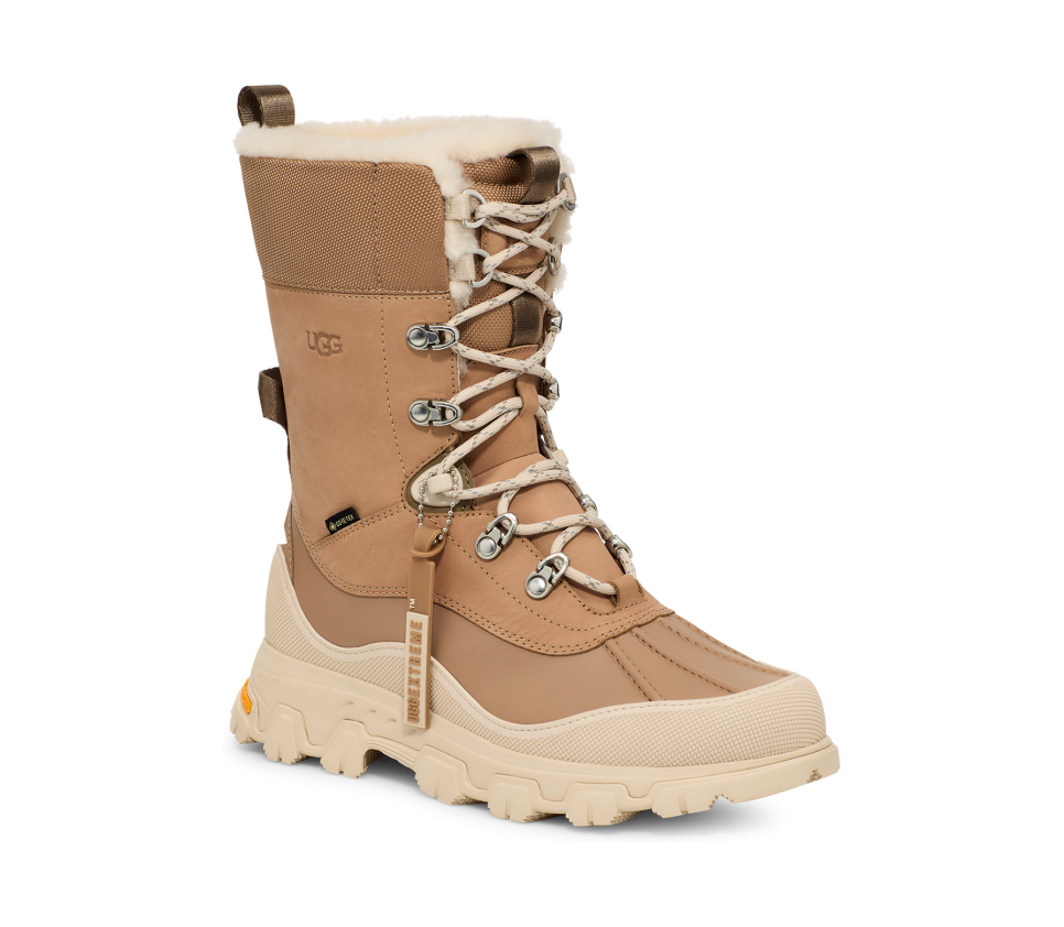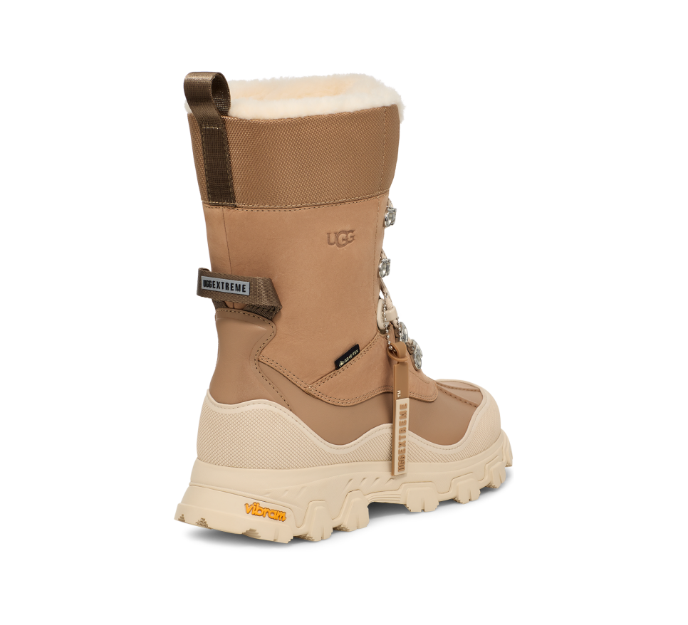 Winter should be fun. So, let's get started: The Adirondack Meridian is rated to withstand temps as low as -32˚C. This evolution on our fan-fave Adirondack offers extreme protection for cold and wet weather conditions. The waterproof upper and gusseted tongue keep wetness out, while the high-tech GORE-TEX® interior lets skin breathe. Featuring the cuffable shaft and pull tab of the original, along with our signature snuggly UGGplush™ upcycled wool blend in both the liner and sock liner, this boot offers unparalleled warmth and coziness in harsh conditions. The Vibram® outsole features ICETREK compound for enhanced traction on slippery or icy surfaces, from the streets to the slopes.