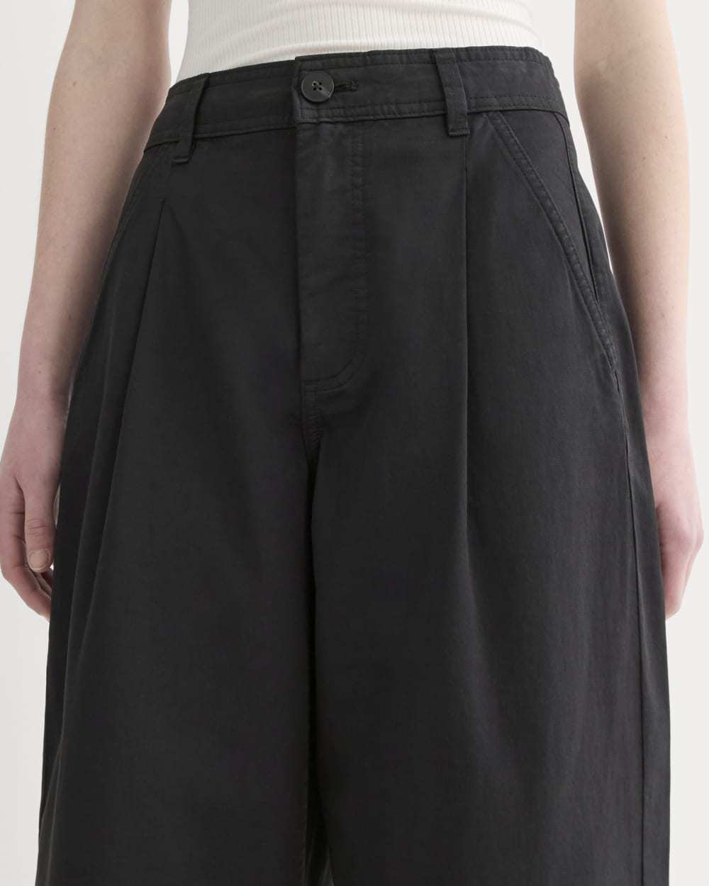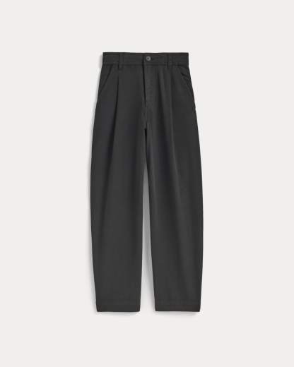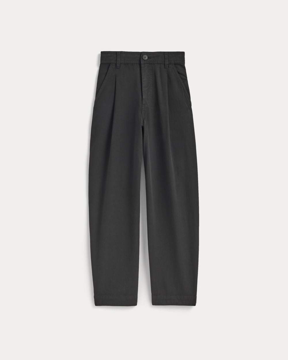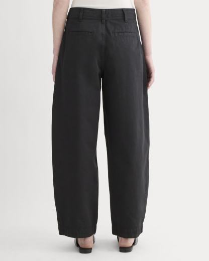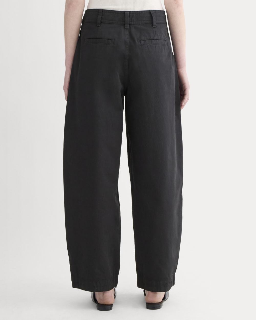 This piece features a high rise, ankle length, barrel leg, with front angled pockets, back welt pockets, front and back darts for shape, zip fly, in organic cotton with a touch of linen.