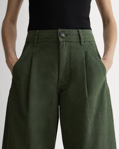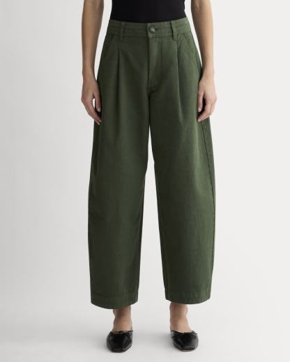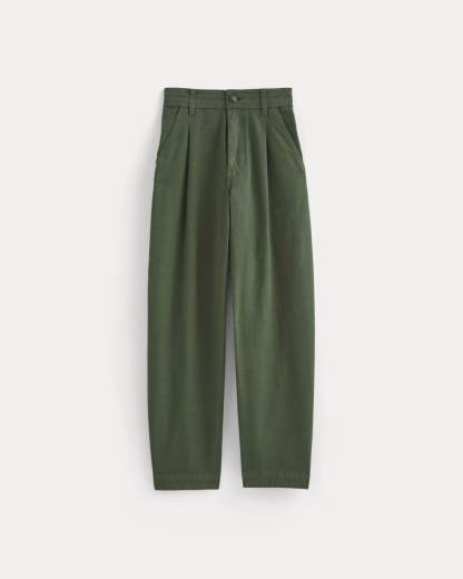 This piece features a high rise, ankle length, barrel leg, with front angled pockets, back welt pockets, front and back darts for shape, zip fly, in organic cotton with a touch of linen.