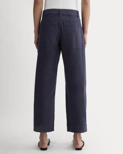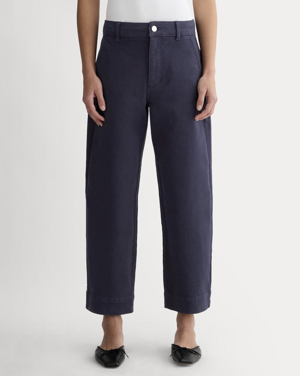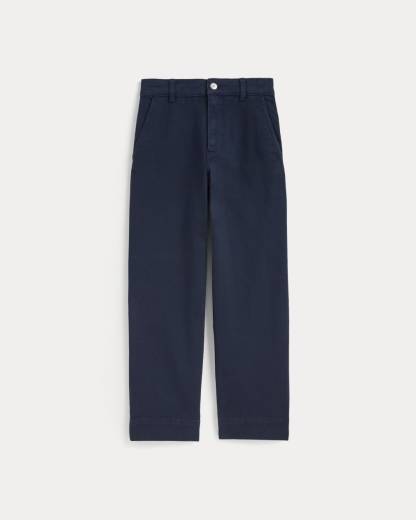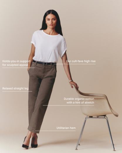 This piece features a waist-nipping high-rise, relaxed, straight silhouette that hits right at the ankle, front angled pockets, and two back patch pockets in our organic cotton twill fabric.